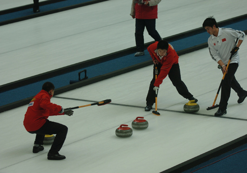 冰壶(Curling)运动十六世纪发源于苏格兰,它是在冬天结冰的池堤或江河上开展的一种游戏,出现后深受人们喜爱,经过漫长的发展过程,演变成为现在的冰壶运动。2冰壶为圆壶状,由特殊石材制成,周长约为91.44厘米,高(壶的底部与顶部)11.43厘米,重量(包括壶柄和壶栓)最大为19.96公斤。冰壶比赛是在长44.5米、宽4.75米的冰壶场地内进行的,场地两端各有一个大本营,与大本营相切的红为底线,过大本营中心与底线平行的线为“丁”字线,接下来是前掷线(与底线平行距大本营中心6.40米)。场地两端距“丁”字线3.66米处,各固定一橡胶起踏器,比赛中运动员蹬起踏器后与壶一起滑行,壶须到达近端前掷线前投出,并且要到达远端前掷线和底线之间的区域才有效。为增大壶与冰面的摩擦,比赛前要在冰面上均匀喷洒水珠,形成点状麻面。比赛中,壶投出后,运动员可为运动的冰壶擦冰,以增加滑行距离。比赛时每队出场4人,每人每局掷壶两次,壶投出后运动员可为运动的冰壶擦冰。双方按照一垒、二垒、三垒和四垒的顺序进行一对一的对抗比赛,两个队共投完16个壶为一局,最后一壶投完后,大本营内距中心近的壶的一方得分,一般比赛打10局,得分多者为胜。十冬会的比赛确定为8局。