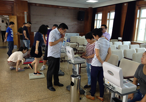 本次共检测了200余人,检测项目包括身高、体重、握力、坐位体前屈、选择反应时、肺活量、闭眼单腿站立、纵跳、一分钟仰卧起坐、俯卧撑和台阶试验等体质检测项目及骨密度、人体成分等。检测结束后,根据每一个受试者实际情况进行了体质状况分析,为受试者讲解了科学健身方法和科学饮食等相关内容,同时为每一位受试者打印了体质状况分析报告和科学健身运动处方。