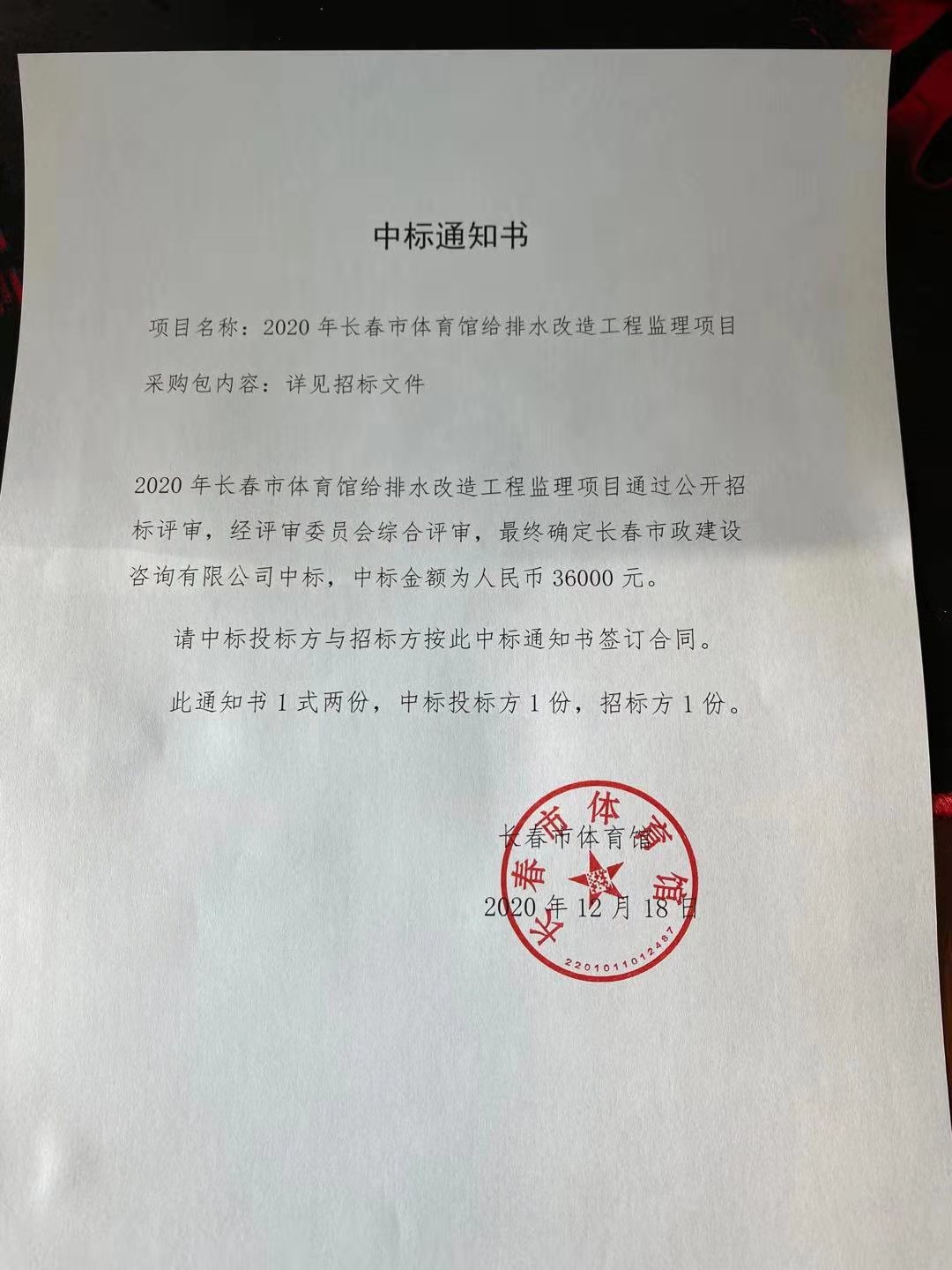 2020年足球即时 馆给排水改造工程监理项目通过公开招标评审,经评审委员会综合评审,最终确定长春市政建设咨询有限公司中标,中标金额为人民币36000元。
