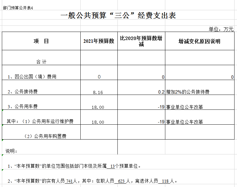 足球即时-雷速即时比分 2021年度“三公”经费财政拨款预算26.16万元,其中:因公出国(境)费0万元,公务用车运行费18万元,公务接待费8.16万元。2021年度预算数比2020年度预算数减少18.8万元,其中,公务用车运行费减少19万元,公务接待费增加0.2万元。
