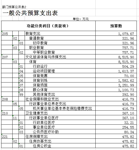足球即时-雷速即时比分 2021年度财政拨款收支总预算15205.28万元。一般公共预算拨款收入10855.28万元,政府性基金预算拨款收入4350万元。2021年财政拨款预算同口径比2020年财政拨款预算增加了3757万元,增长了25.33%。一般公共预算支出10855.28万元,其中,教育支出1079.67万元,文化体育与传媒支出8515.9万元,住房保障支出475.82万元,医疗卫生支出367.1万元,社会保障和就业支出416.79万元。政府性基金预算支出4350万元,其中,其他支出4159万元。