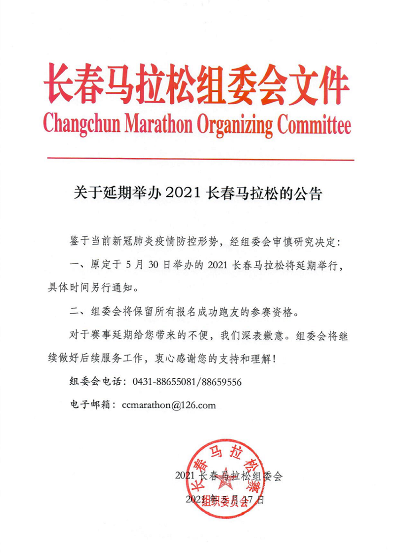 关于延期举办2021长春马拉松的公告