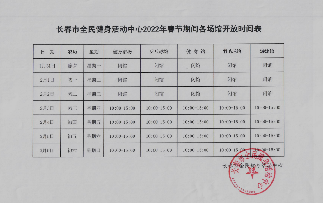 长春市全民健身活动中心2022年春节期间各场馆开放时间